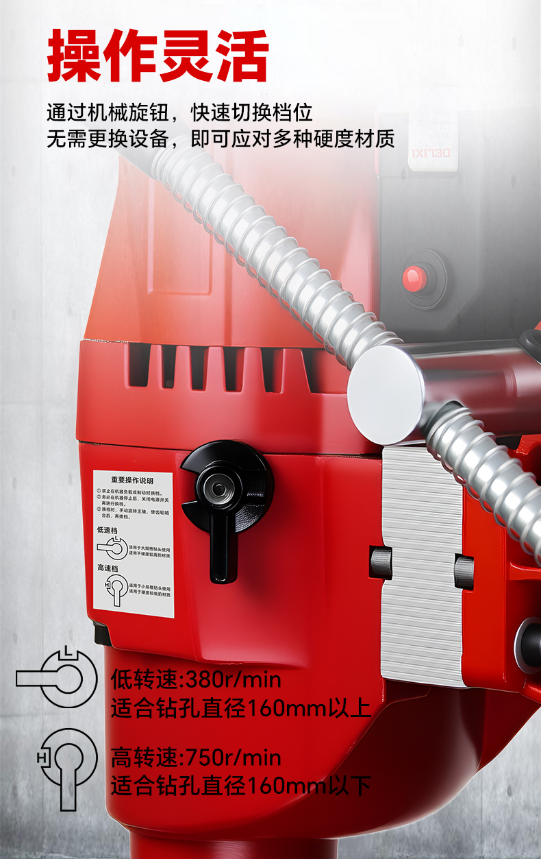 两档变速设计,可根据不同的钻孔材料和作业需求,轻松切换高速或低速档位,实现高效作业。