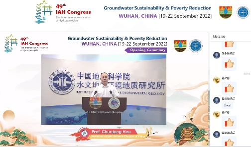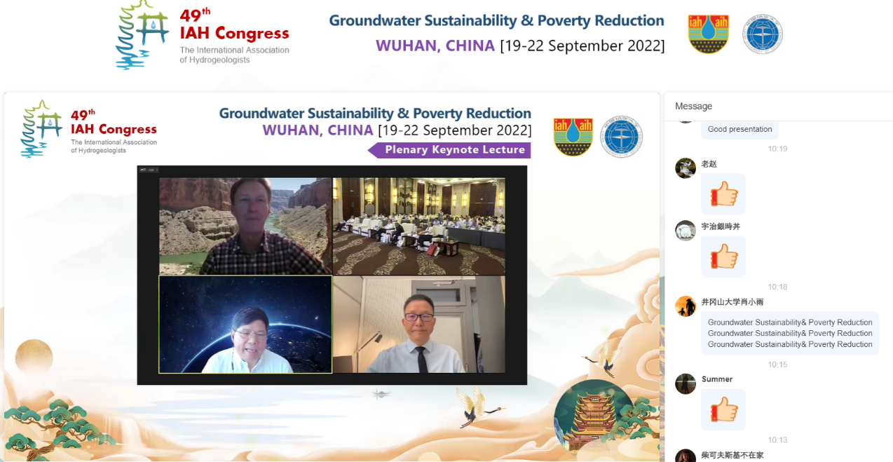 中国地质大学(武汉)校长王焰新院士、国际水文地质学家协会(IAH)主席David Kreamer教授、联合国教科文组织政府间水文计划(UNESCO IHP)主席余钟波教授、国家自然科学基金委副主任侯增谦院士等领导和专家在现场和线上出席了开幕式,近万人在线观看开幕式全球直播。本届大会主题为地下水可持续性与消除贫困,大会围绕全球变化与地下水循环、地下水水质与人类健康等16个专题开展深入交流和研讨。