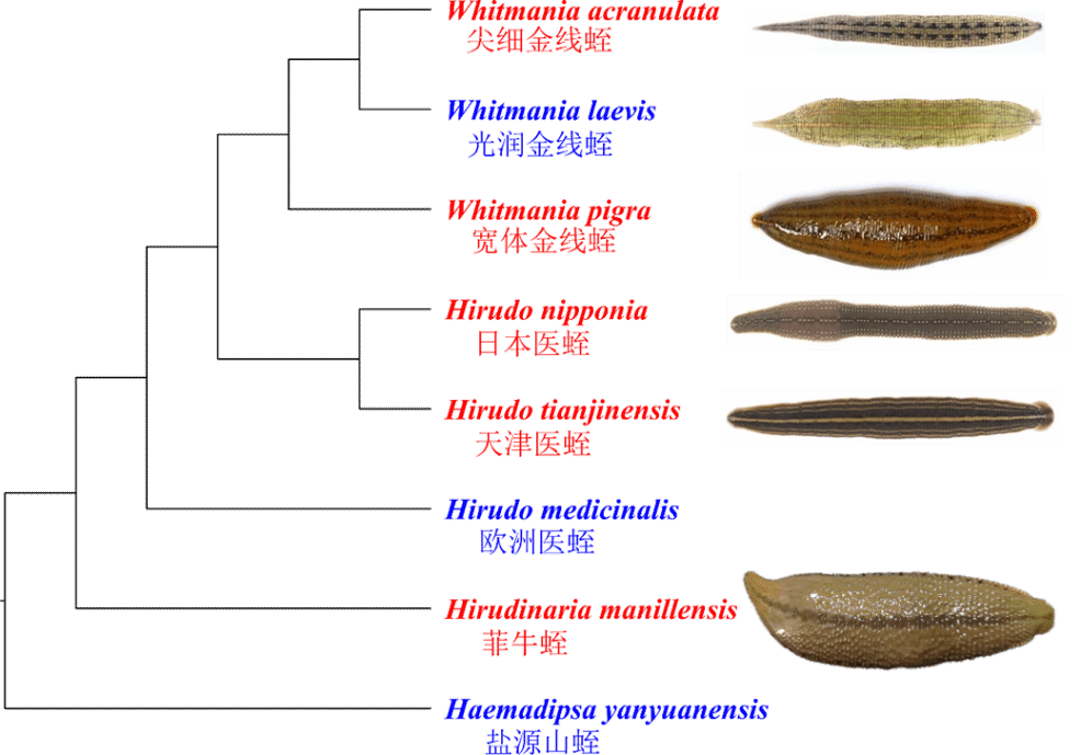 图1. 我国常见药用水蛭(红色)及其近缘类群的系统发育关系