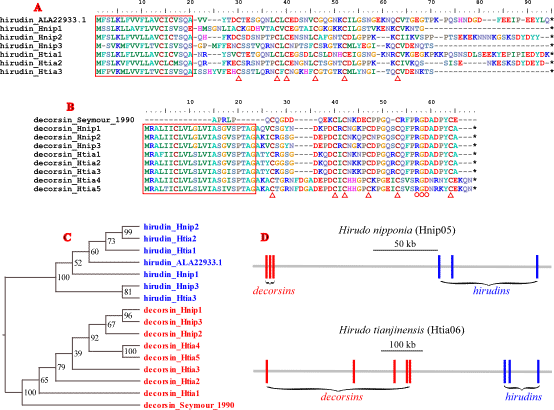 图2. 日本医蛭和天津医蛭水蛭素和抗栓肽比较:A. 水蛭素序列比对;B. 抗栓肽序列比对;C. 水蛭素和抗栓肽系统发育关系;D. 水蛭素和抗栓肽在染色体上的分布