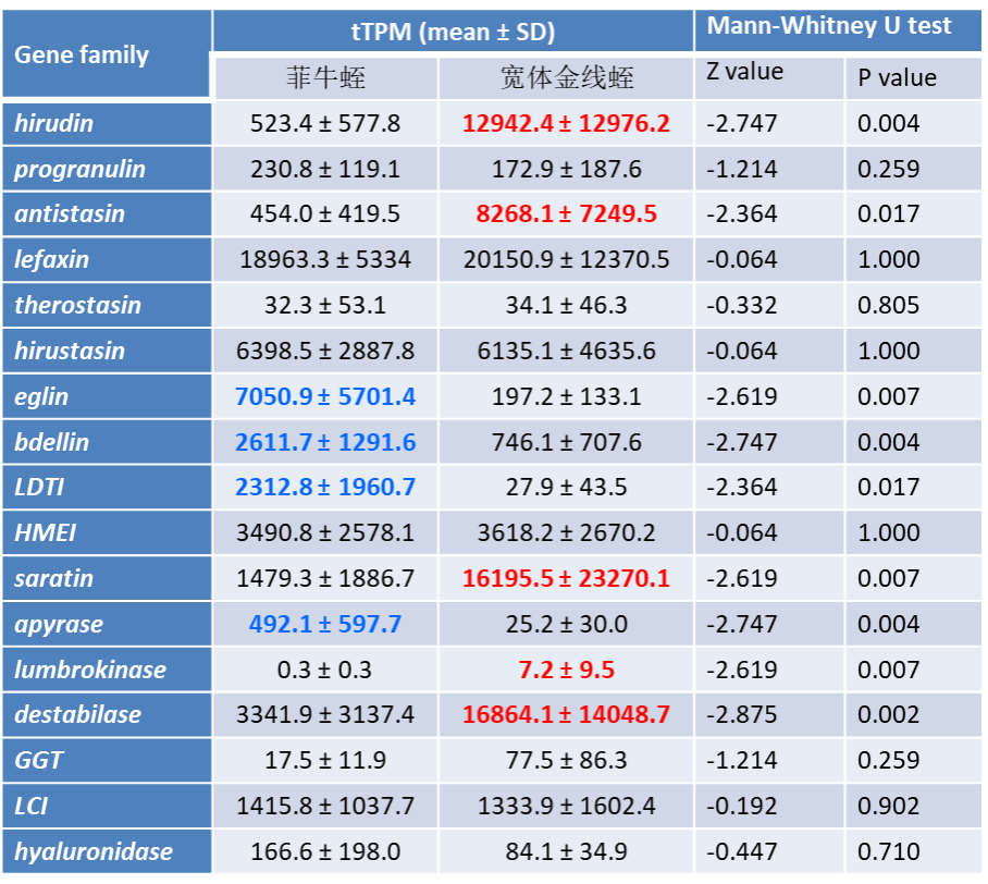 表1. 菲牛蛭和宽体金线蛭抗血栓基因家族的表达量比较