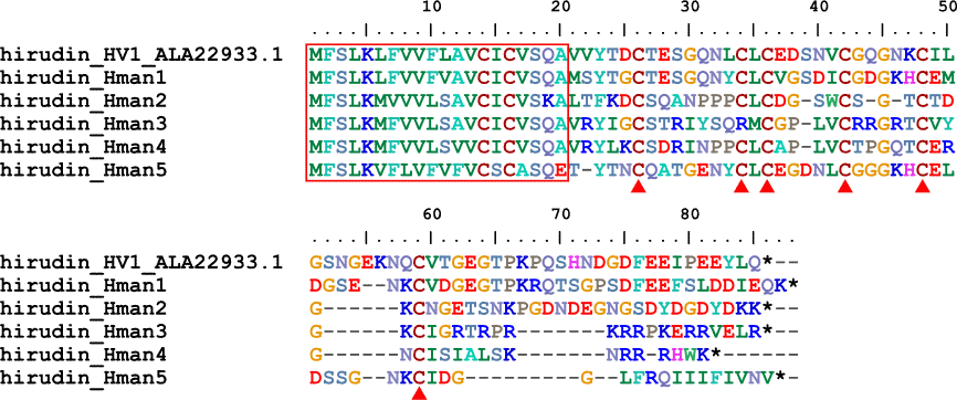 图3. 菲牛蛭5个水蛭素及来自欧洲医蛭的水蛭素蛋白序列比对