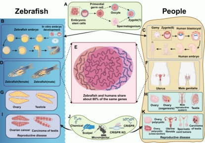 众所周知,斑马鱼(Danio rerio)已成为发育生物学、遗传学、细胞生物学和药物开发等多个研究领域的重要模式生物。斑马鱼的基因与人类的相似度达到87%,素有“水中小白鼠”之称,包括癌症在内的约2000种人类疾病能出现在斑马鱼身上。这种相似性使斑马鱼能够高效、准确地模拟人类生殖疾病,显著提升其在研究生殖疾病发病机制中的应用价值,并为开发旨在改善生殖疾病的治疗干预措施提供了有力支持。目前,已有多种斑马鱼疾病模型被建立,涵盖了生殖再生、性腺发育异常、生殖系统感染、性激素调节失衡以及生殖系统肿瘤等多个领域。这些疾病模型为推动生殖疾病精准治疗的研究提供了宝贵的思路和理论依据。