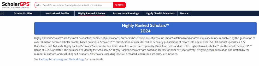 ScholarGPS汇集了全球各学科领域3000多万名学者的信息档案以及海量论文、专利、书籍大数据资源。应用人工智能、数据挖掘、机器学习和其他数据科学技术,对全球超过3000万学者和55000家机构在各个领域、学科和专业方面(14个领域、177个学科及超过35万个专业)的研究成果(发表论文数)、影响力(引用次数,已排除自引)和论文质量三项指数进行综合分析,为科学家长期科研表现提供了更为全面综合的评价,更客观、更真实地反映科学家的学术影响力。(文:周兵;审核:贺根和、隋岩)