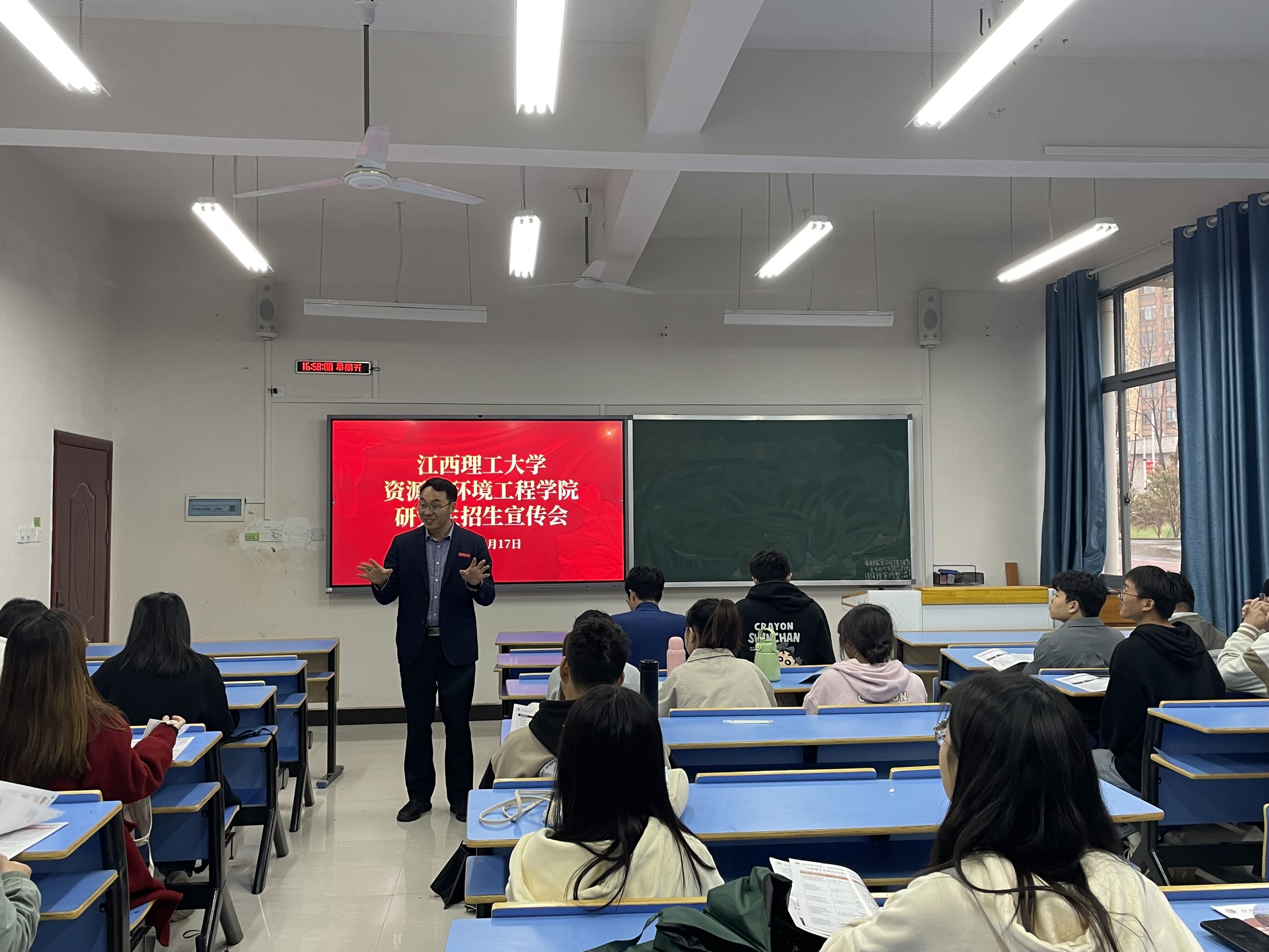 3月17日下午,江西理工大学资源与环境工程学院何桂春院长一行莅临我院交流指导,在21栋教学楼分年级为我院学子开展了研究生招生与调剂宣讲会。江西理工大学资源与环境工程学院党委副书记饶先发、研究生秘书尹琼进行了现场指导,2019级、2020级环境工程专业50余名学生参会。