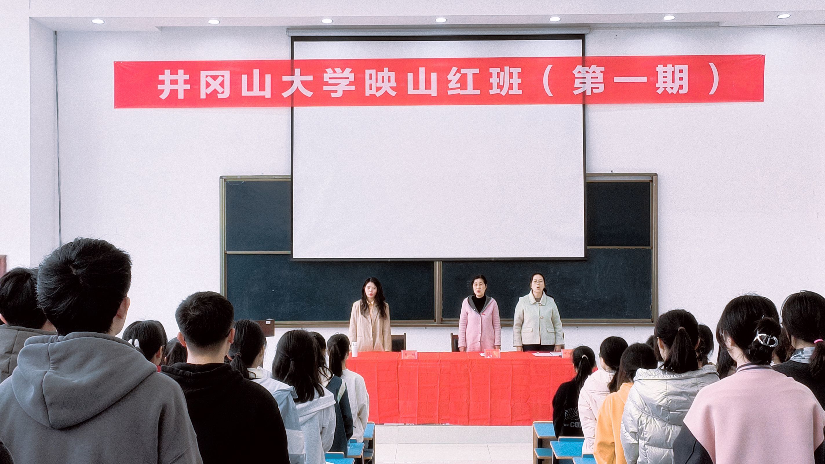 开班仪式奏唱国歌中拉开序幕,彭青宣布井冈山大学映山红班正式开班授旗学员们提出三点要求:一是要坚定理想信念,锤炼品德修为;二是要提升专业本领,增强综合素质;是培养团队意识,打造一班一品。希望同学们严格要求自己,遵守班级制度,争做井冈山精神的传承者