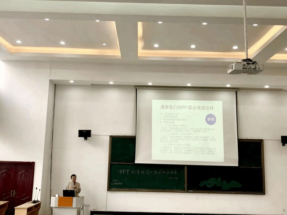 在讲座中,肖皓瑞从“PPT制作常见问题”、“ PPT制作方法技巧”、“PPT制作应用原则”这三个方面进行讲解。他指出,同学们在制作PPT时要避免“文字信息过多、图片质量过低、色彩过于花哨、排版逻辑混乱、完成后不测试”这几个雷区。就“如何提升PPT的美感”方面,他从页面的相似性、幻灯片大小、配色、字体、排版、艺术效果等方面给同学们支招。他还建议同学们多参考网络上成熟的PPT,进一步学习制作PPT的精髓。