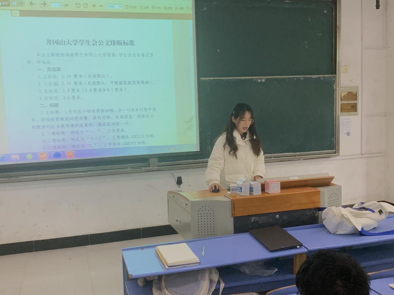 根据井冈山大学学生会公文排版标准,主讲人李新旃对公文的页边距、标题、正文、落款和页码的排版标准进行了详细介绍,并着重强调了标题和正文的排版要求。随后,指出了此前各项活动的公文排版中存在的一些问题,希望相关工作人员能够加以改进。最后,她强调了公文排版的重要性,要求今后的各种公文严格按照排版标准进行写作。