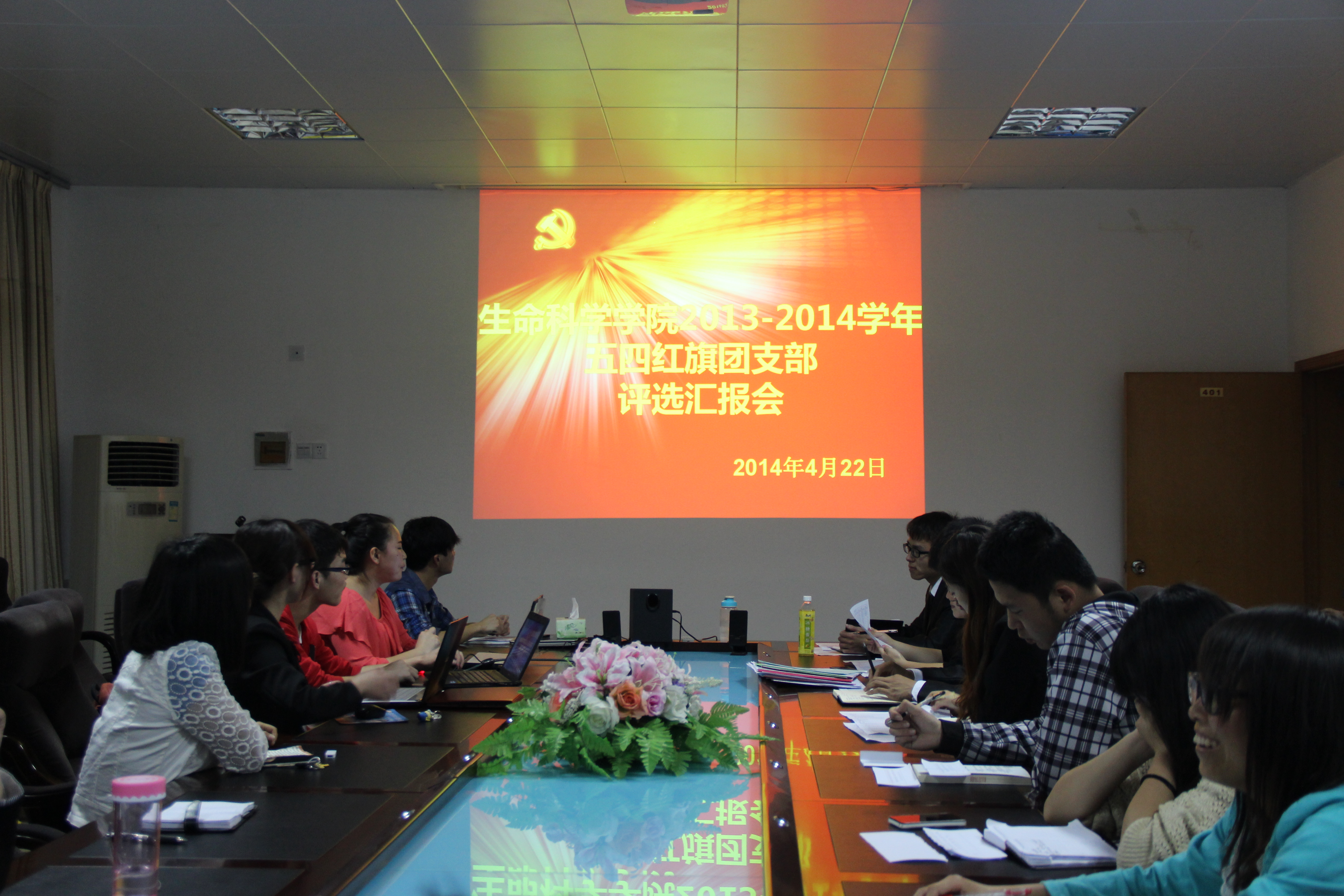4月22日晚,我院团委在二栋教学楼401室举行了2013-2014学年度“五四红旗团支部”评选汇报会。会议由院团委副书记吴丽花主持,团委学生会干部、各班班长及团支书与会,13个班级团支部进行了汇报评选。