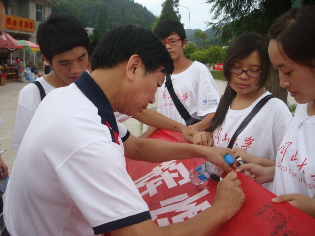 在今后的几天中,队员们的身影活跃在井冈山的青山绿水之中,在指导老师的的带领下,队员们参观了井冈山革命博物馆、井冈山革命烈士陵园、领袖峰和毛泽东故居等地,走访了红军后人,通过参观走访,队员们了解了当年的革命史、学习了老红军们的革命精神。在参观走访的过程中,队员们举行了重温入党誓词宣誓仪式,精心开展了纪念“建团90周年”图说及爱国主义签名活动,以图文并茂的形式配以解说、演唱向当地的群众及游人生动展示了共青团“建团90周年”的辉煌历程以及党的发展路程,得到了当地群众的热情参与和一致认可。活动期间,院党委书记许斌亲临活动现场慰问队员,并对大家的工作表示了充分肯定。于此同时,队员们还结合专业开展了井冈山生态环境调查,充分利用每晚的休息时间在大井村开展了“辉煌90载”爱国主义电影大放送活动。活动中,队员们大力开展红色文化宣传,寓教于乐,群众们不仅观赏到精彩的电影,受到了爱国主义精神的感染,业余生活也得到了极大的丰富。