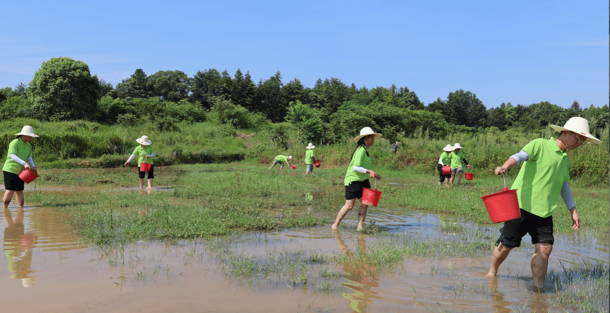 图 冯慧颖及团队在田间洒菜籽枯