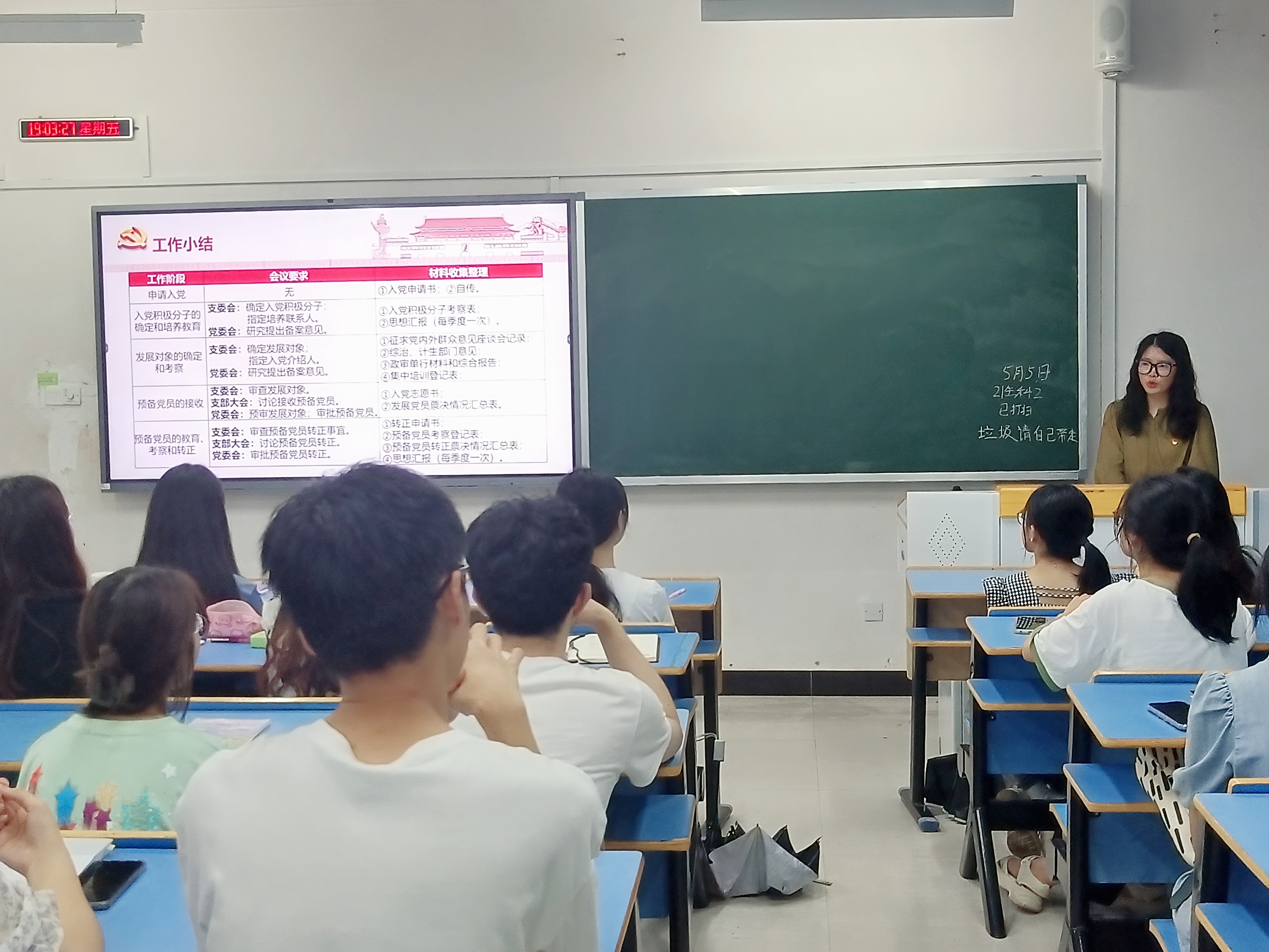 为提高入党积极分子思想觉悟,端正入党动机,加深对党的认识和了解,5月5日晚,我院22级辅导员肖虹在21栋103教室为入党积极分子进行理论培训。