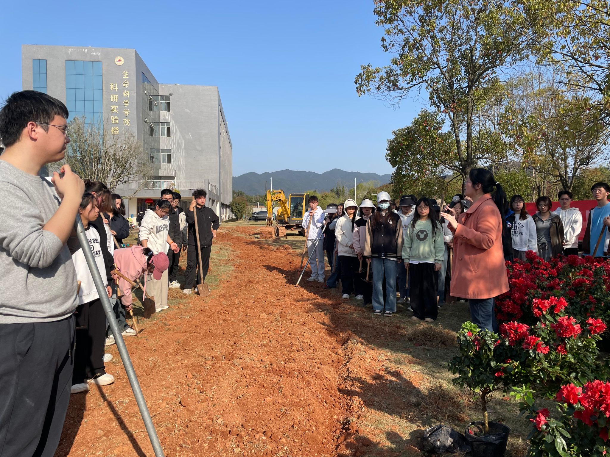 活动特别设置“红色微课堂”环节,学生在劳作间隙聆听胡雪华老师介绍映山红培育技术,学院党委副书记何旭梅讲述学校与映山红的历史渊源。当看到亲手种植的映山红与班徽交相辉映时,学员在活动现场不禁感叹:“我们种下的不仅是映山红,更是红色基因的传承。”